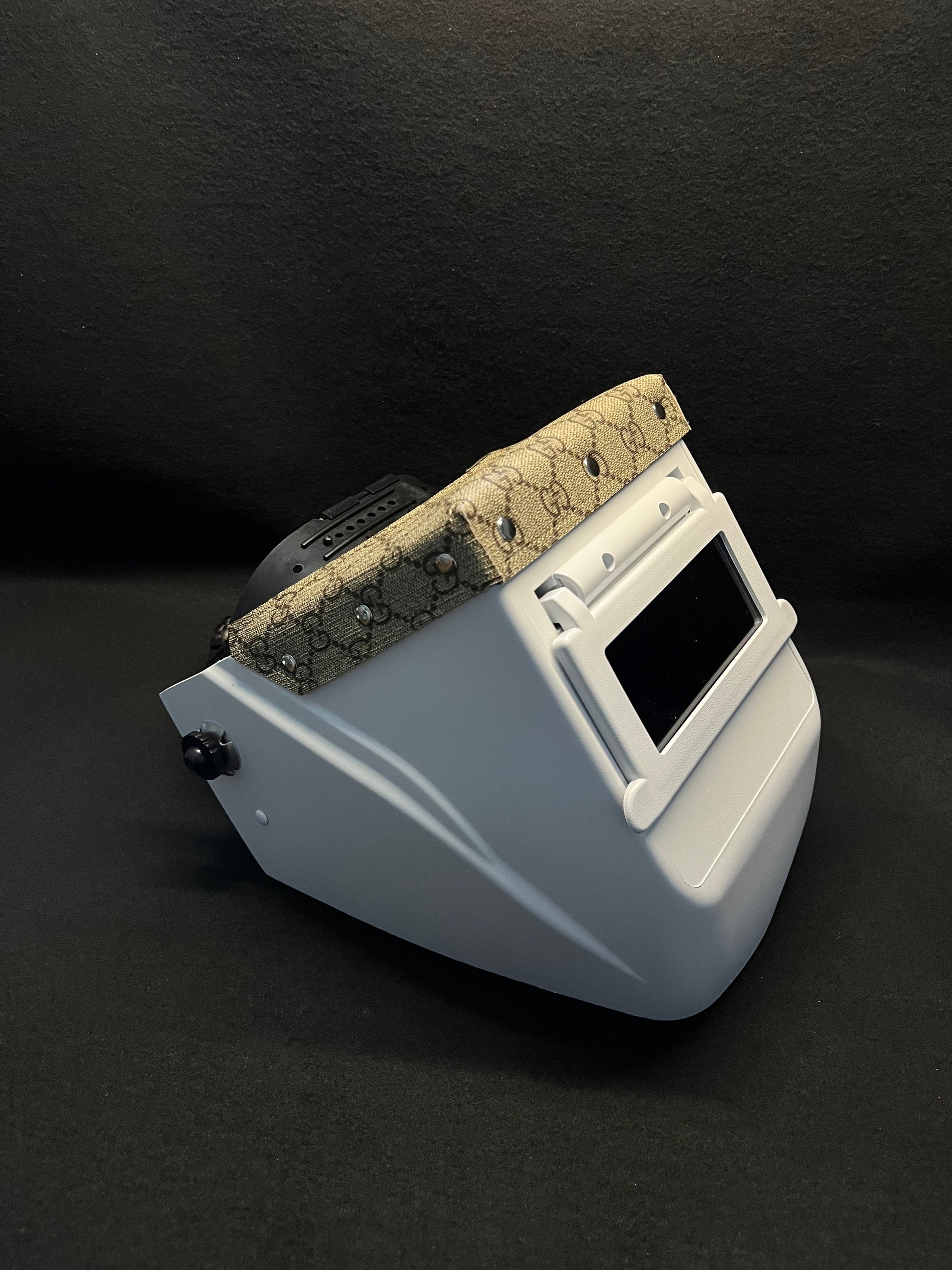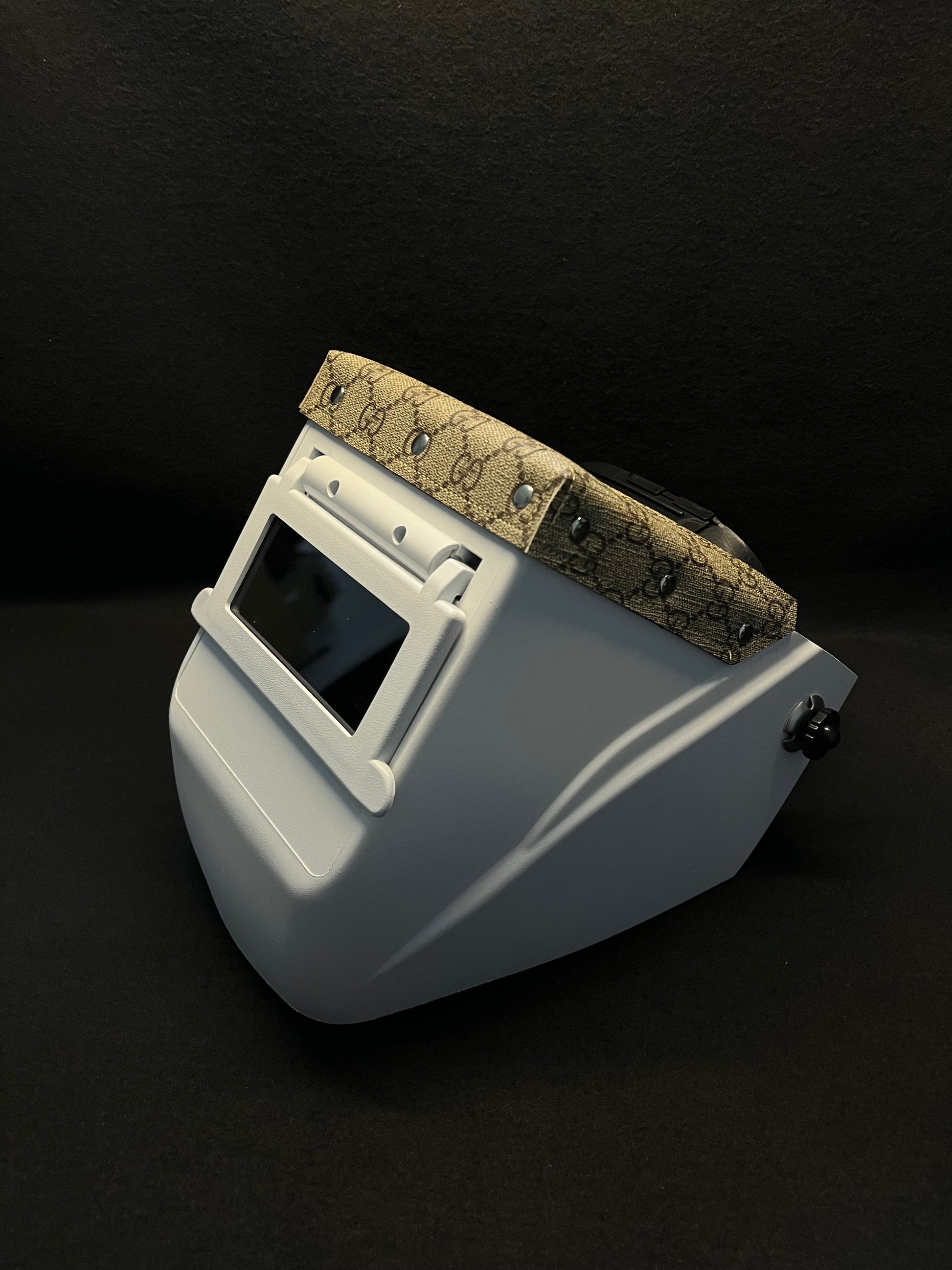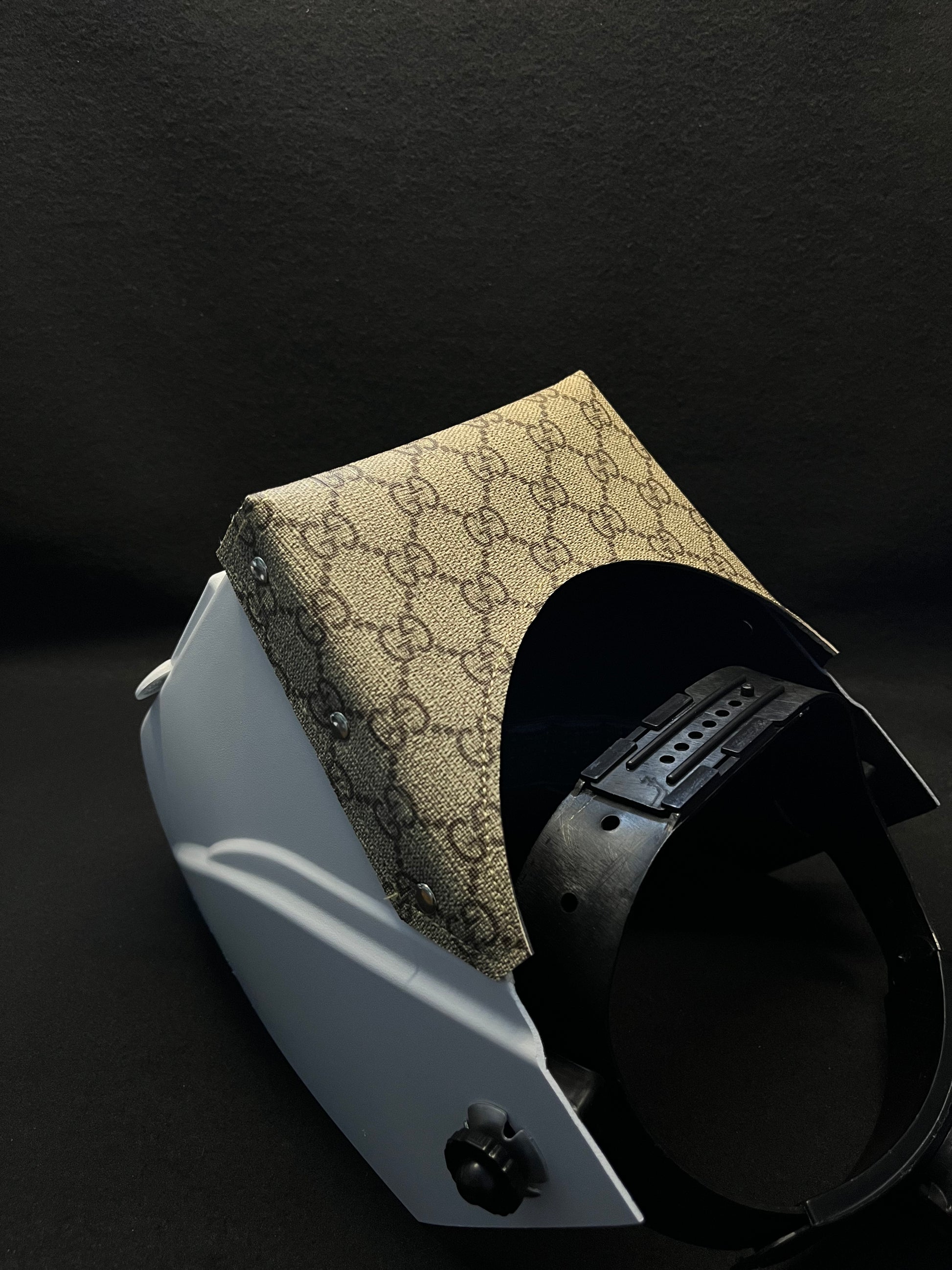 White hood with a tan gucci top bib and silver rivets
