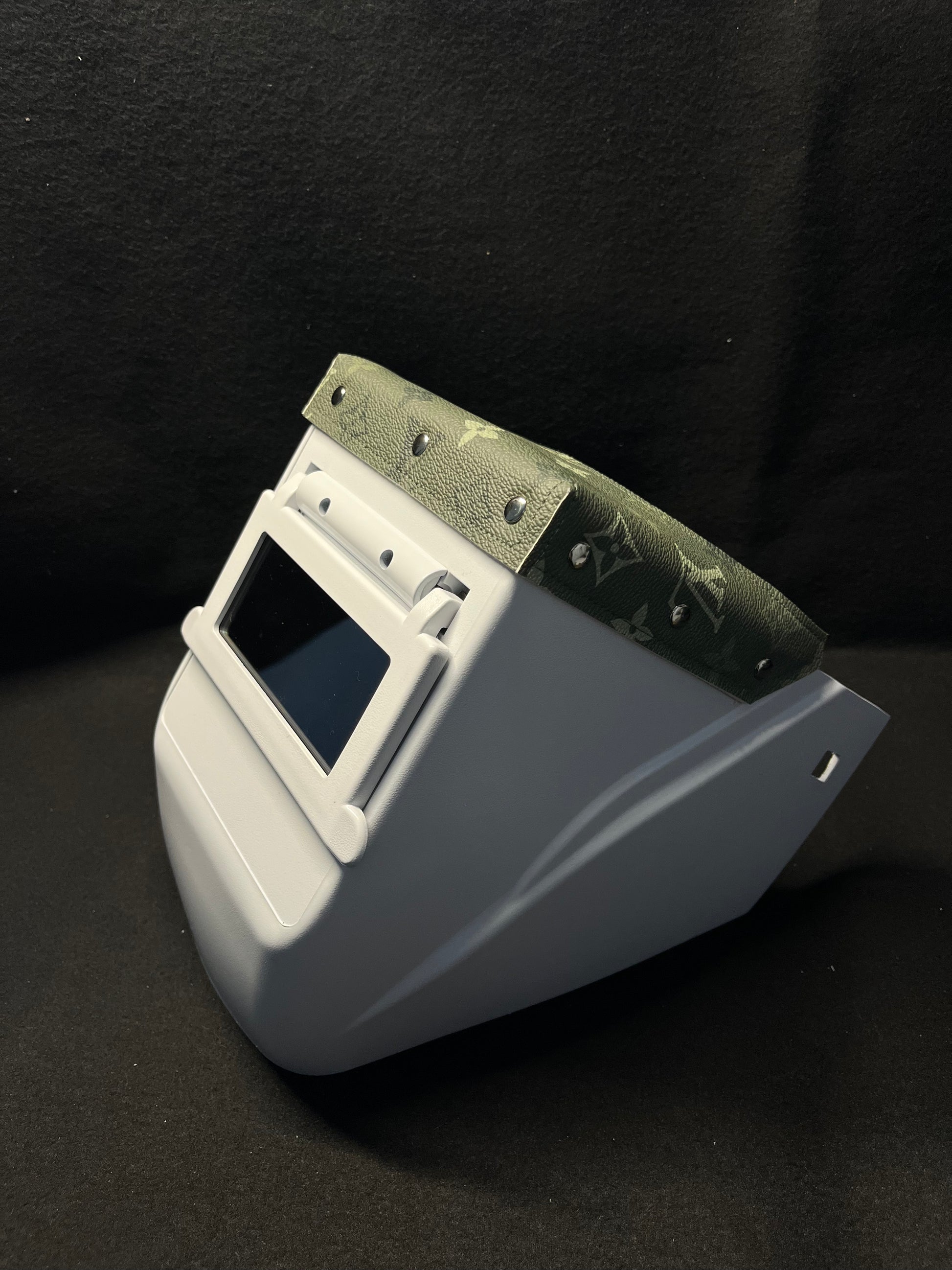 White hood with an olive green LV top bib